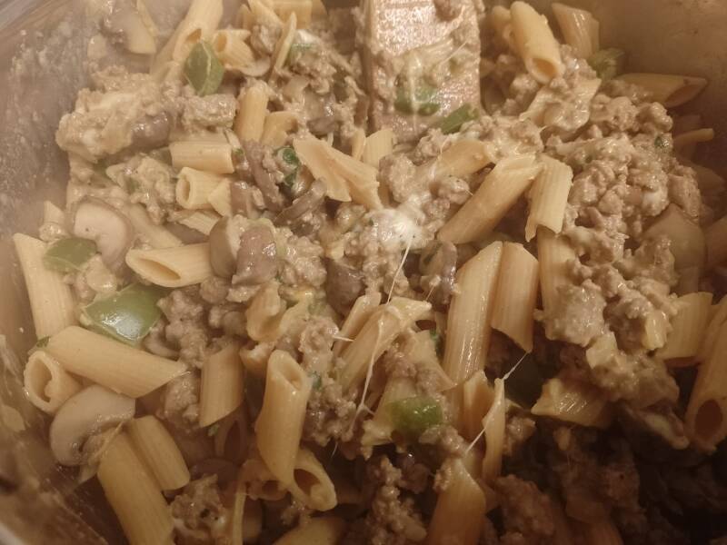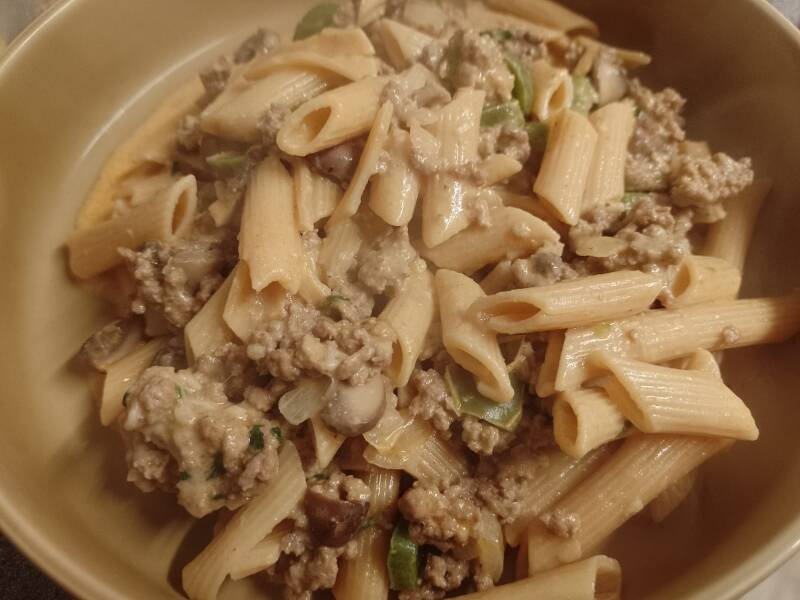 Ingredients: 1 Green Pepper, 1 White Onion, 3 Large cloves of Garlic, 250g Chestnut Mushrooms, 50g Salted Butter, 500g Good Quality Ground Beef Mince, 1/4 tsp Good Quality Salt (I use Celtic Grey Salt), Ground Black Pepper to season, 1 tsp Smoked Paprika, 1/2 tsp Onion Salt, 1/2 tsp Garlic Granules, 250g bag of Chickpea Penne, 50g Full fat Cream Cheese, 1/3 cup of Full fat Greek Yoghurt, x1 125g Drained Ball of Full Fat Mozzarella, 50g grated Double Gloucester Cheese, 2 tsp Fresh Chopped Coriander, 1/2 a cup of the pasta cooking water.