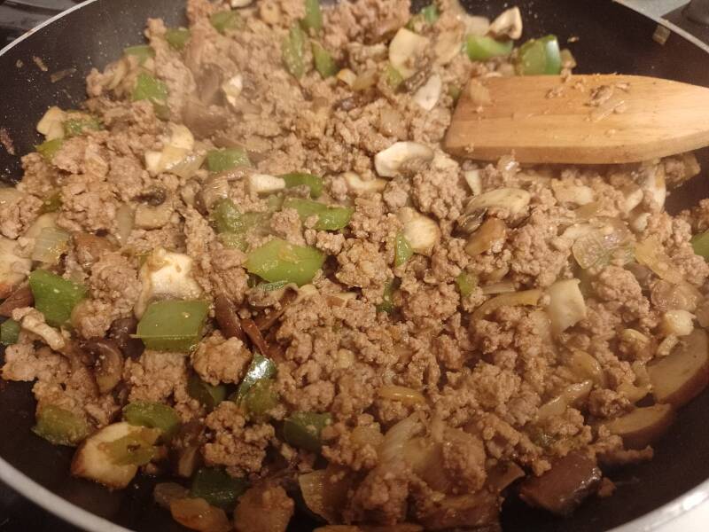 Make a space in the centre of the pan pushing it all to the sides and place the minced beef in the centre. Move it around and break it up until it is cooked through and evenly distributed between all the other ingredients. (Another 5 plus minutes.)